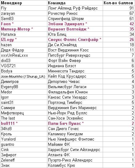 1 место – 5 млн. гольденов - Fly (Лонг Айленд Руф Райдерс) 2 место – 4 млн. гольденов - zarayan (Рочестер Ринос) 3 место – 3 млн. гольденов - Sem83 (Спрингфилд Шторм) 4 место – 2 млн. гольденов - Наталка (Юта Блиц) 5 место – 1 млн. гольденов - hazen (Ди.Си.Юнайтед)